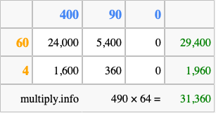 That's all there is to it! As you can see from the box above, the answer to 490 times 64 using the box method is 31,360.