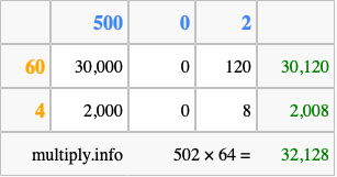 That's all there is to it! As you can see from the box above, the answer to 502 times 64 using the box method is 32,128.