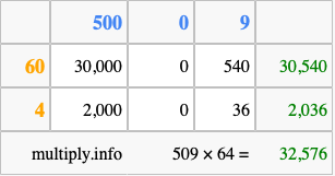That's all there is to it! As you can see from the box above, the answer to 509 times 64 using the box method is 32,576.