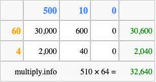 Below is an illustration showing you how to calculate 510 times 64 using the box method, using the instructions above.