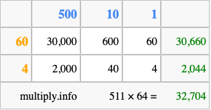 That's all there is to it! As you can see from the box above, the answer to 511 times 64 using the box method is 32,704.