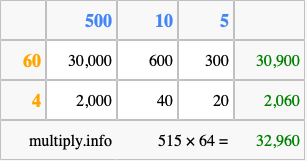 That's all there is to it! As you can see from the box above, the answer to 515 times 64 using the box method is 32,960.