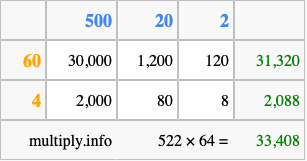 That's all there is to it! As you can see from the box above, the answer to 522 times 64 using the box method is 33,408.