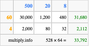 That's all there is to it! As you can see from the box above, the answer to 528 times 64 using the box method is 33,792.