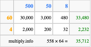 That's all there is to it! As you can see from the box above, the answer to 558 times 64 using the box method is 35,712.