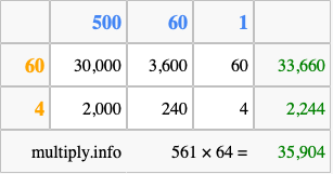 Finally, we add up all the sums we found in step 3 to get our final answer to 561 times 64.