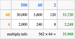 Finally, we add up all the sums we found in step 3 to get our final answer to 562 times 64.