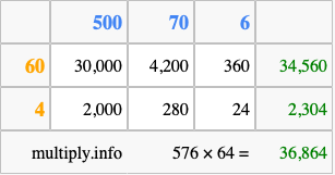 That's all there is to it! As you can see from the box above, the answer to 576 times 64 using the box method is 36,864.
