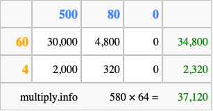 Finally, we add up all the sums we found in step 3 to get our final answer to 580 times 64.