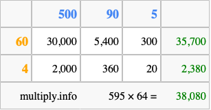 Finally, we add up all the sums we found in step 3 to get our final answer to 595 times 64.