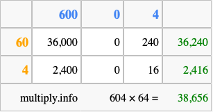That's all there is to it! As you can see from the box above, the answer to 604 times 64 using the box method is 38,656.