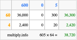 That's all there is to it! As you can see from the box above, the answer to 605 times 64 using the box method is 38,720.