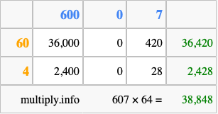 That's all there is to it! As you can see from the box above, the answer to 607 times 64 using the box method is 38,848.