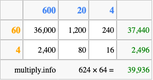 Finally, we add up all the sums we found in step 3 to get our final answer to 624 times 64.