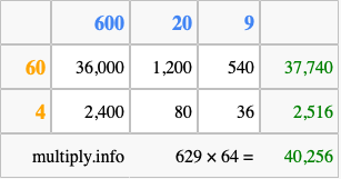 That's all there is to it! As you can see from the box above, the answer to 629 times 64 using the box method is 40,256.