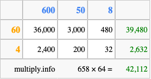 That's all there is to it! As you can see from the box above, the answer to 658 times 64 using the box method is 42,112.