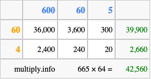 Below is an illustration showing you how to calculate 665 times 64 using the box method, using the instructions above.