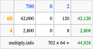 That's all there is to it! As you can see from the box above, the answer to 702 times 64 using the box method is 44,928.
