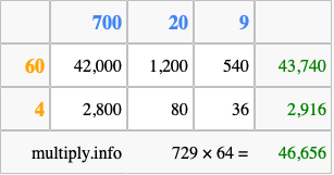 That's all there is to it! As you can see from the box above, the answer to 729 times 64 using the box method is 46,656.