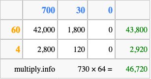That's all there is to it! As you can see from the box above, the answer to 730 times 64 using the box method is 46,720.
