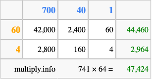 That's all there is to it! As you can see from the box above, the answer to 741 times 64 using the box method is 47,424.