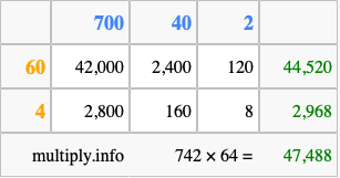 Finally, we add up all the sums we found in step 3 to get our final answer to 742 times 64.
