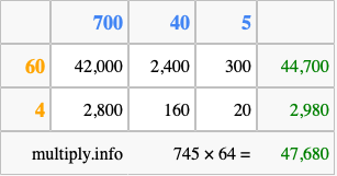 Below is an illustration showing you how to calculate 745 times 64 using the box method, using the instructions above.