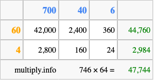 That's all there is to it! As you can see from the box above, the answer to 746 times 64 using the box method is 47,744.
