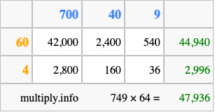 That's all there is to it! As you can see from the box above, the answer to 749 times 64 using the box method is 47,936.