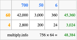 Finally, we add up all the sums we found in step 3 to get our final answer to 756 times 64.