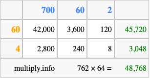That's all there is to it! As you can see from the box above, the answer to 762 times 64 using the box method is 48,768.