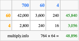 That's all there is to it! As you can see from the box above, the answer to 764 times 64 using the box method is 48,896.
