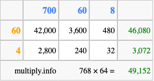That's all there is to it! As you can see from the box above, the answer to 768 times 64 using the box method is 49,152.