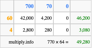 That's all there is to it! As you can see from the box above, the answer to 770 times 64 using the box method is 49,280.