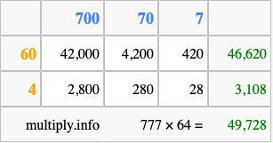 That's all there is to it! As you can see from the box above, the answer to 777 times 64 using the box method is 49,728.