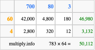 Finally, we add up all the sums we found in step 3 to get our final answer to 783 times 64.