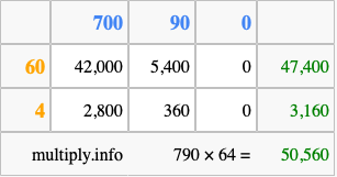 Finally, we add up all the sums we found in step 3 to get our final answer to 790 times 64.