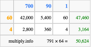 Below is an illustration showing you how to calculate 791 times 64 using the box method, using the instructions above.