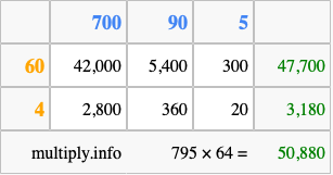 That's all there is to it! As you can see from the box above, the answer to 795 times 64 using the box method is 50,880.