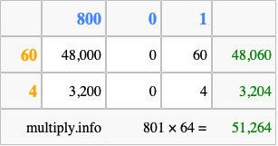 That's all there is to it! As you can see from the box above, the answer to 801 times 64 using the box method is 51,264.
