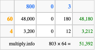 That's all there is to it! As you can see from the box above, the answer to 803 times 64 using the box method is 51,392.