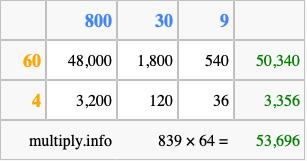 That's all there is to it! As you can see from the box above, the answer to 839 times 64 using the box method is 53,696.