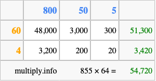 That's all there is to it! As you can see from the box above, the answer to 855 times 64 using the box method is 54,720.