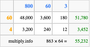 That's all there is to it! As you can see from the box above, the answer to 863 times 64 using the box method is 55,232.