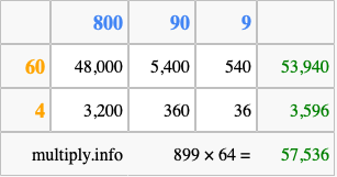 That's all there is to it! As you can see from the box above, the answer to 899 times 64 using the box method is 57,536.