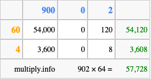 Finally, we add up all the sums we found in step 3 to get our final answer to 902 times 64.