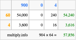 Finally, we add up all the sums we found in step 3 to get our final answer to 904 times 64.