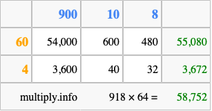 That's all there is to it! As you can see from the box above, the answer to 918 times 64 using the box method is 58,752.
