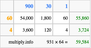 That's all there is to it! As you can see from the box above, the answer to 931 times 64 using the box method is 59,584.