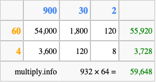 That's all there is to it! As you can see from the box above, the answer to 932 times 64 using the box method is 59,648.
